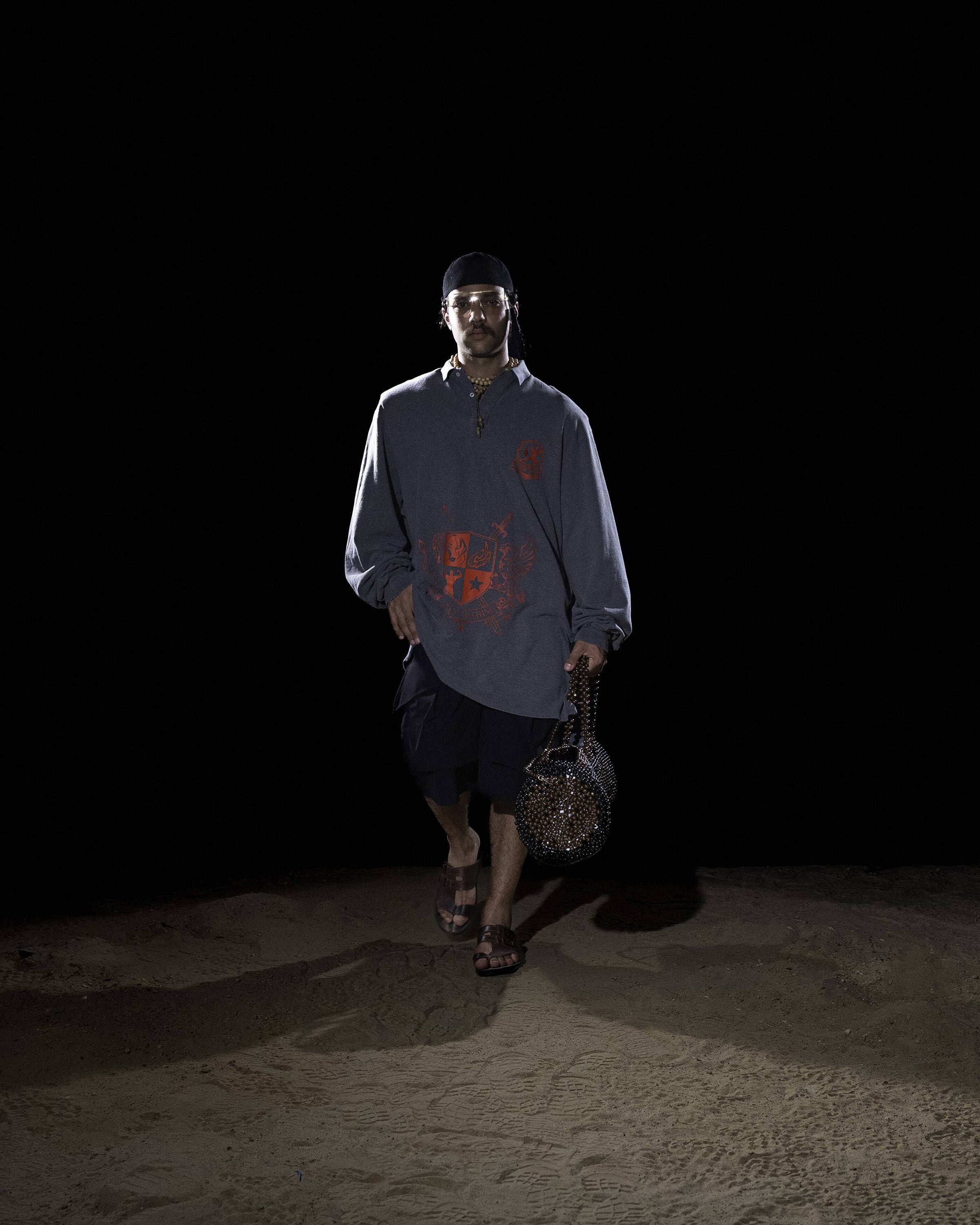 The garments make this repetition tangible. References collide across centuries, with the 2010s, 2000s, and 90s sitting beside medieval echoes, proof that history does not just repeat but recycles. Linen mimics denim, polos are sculpted from wood, and a plastic shopping bag is transformed in scuba. Each piece insists on one identity while concealing another, echoing how power dresses itself in charm to disguise contradiction. In SS26, illusion is not just material but political, a reminder that beauty and seduction are still mobilized as tools of diplomacy.